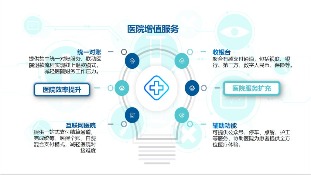 1、一次就诊,一次缴费;2、无感支付,可缩短患者60%就诊时间,3、可实现出院床边结算,简化出院手续,